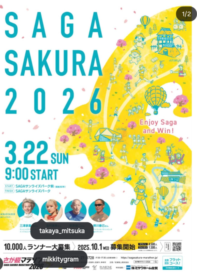 さが桜マラソン2026 エントリー 2025/10/12 来年3月22日開催の「さが桜マラソン2026」にエントリーしました🏃 フルマラソンは今回で3回目になりますが、最近練習はサボり気味のため、あと5ヶ月で調整できるか不安です💦 目標4時間半!自己ベスト更新目指します!