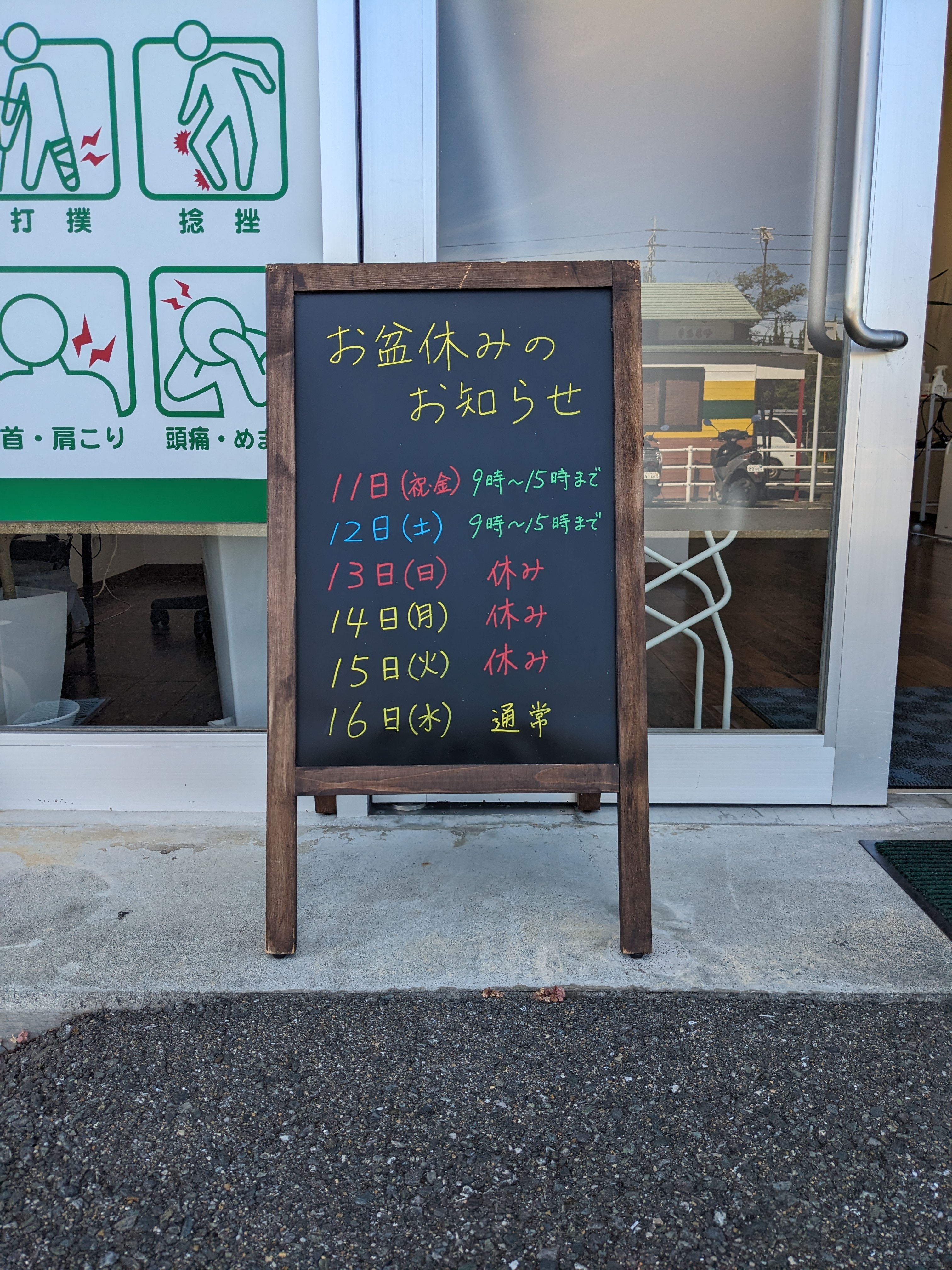 お盆休みのお知らせ 2023/08/04 お盆休みのお知らせです。 11日(祝・金)9:00〜15:00まで 12日(土)9:00〜15:00まで 13日(日)休み 14日(月)休み 15日(火)休み 16日(水)通常受付 よろしくお願いいたします。