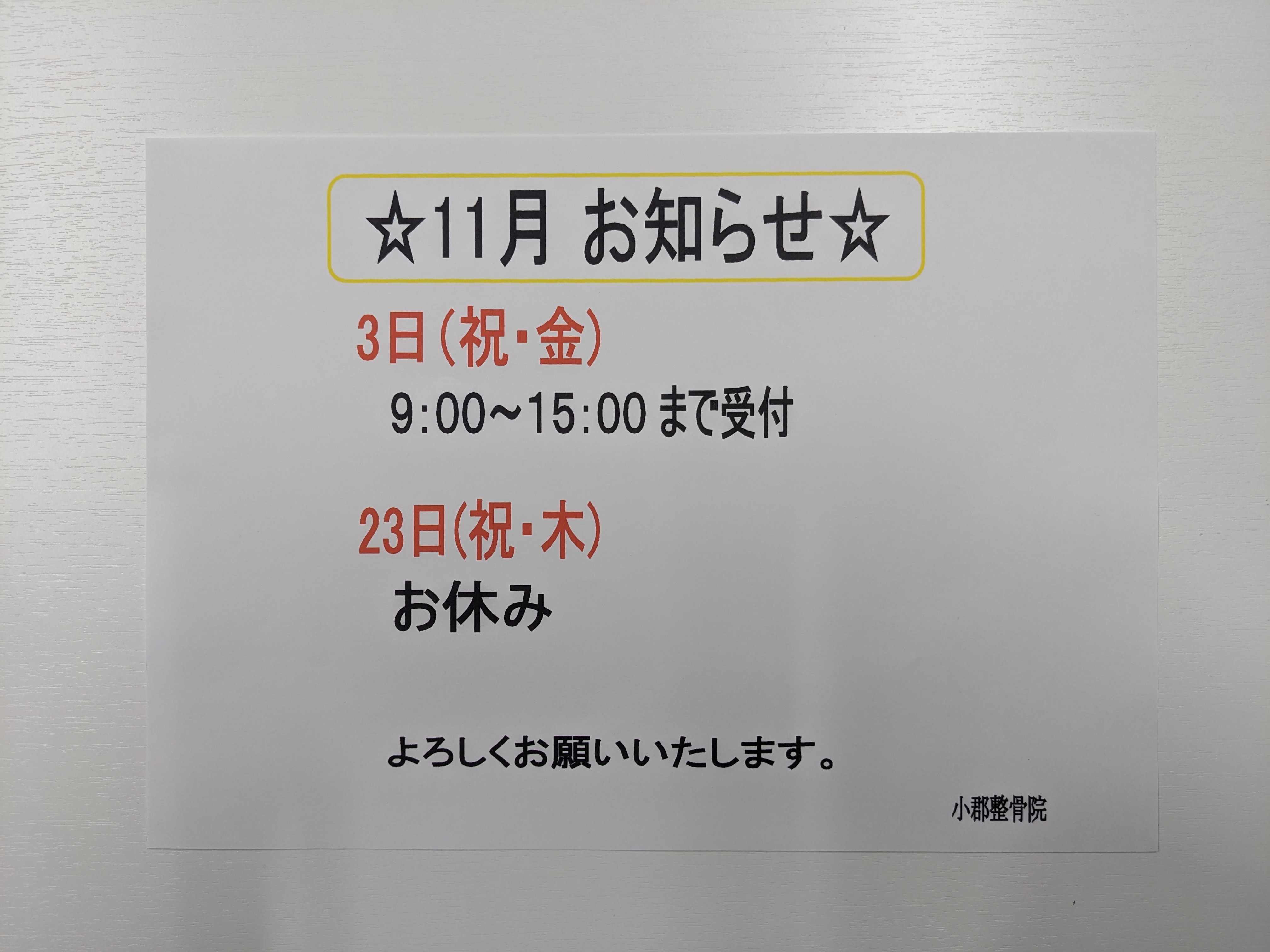 11月のお知らせ 2023/10/31 11月の祝日は↓↓↓ 【3日(金)文化の日】 9:00〜15:00まで受付 【23日(木)勤労感謝の日】 お休み 今年も残り2ヶ月。 やり残した事はないですか? 今年立てた目標はクリアできていますか? 自分に言い聞かせています🤣