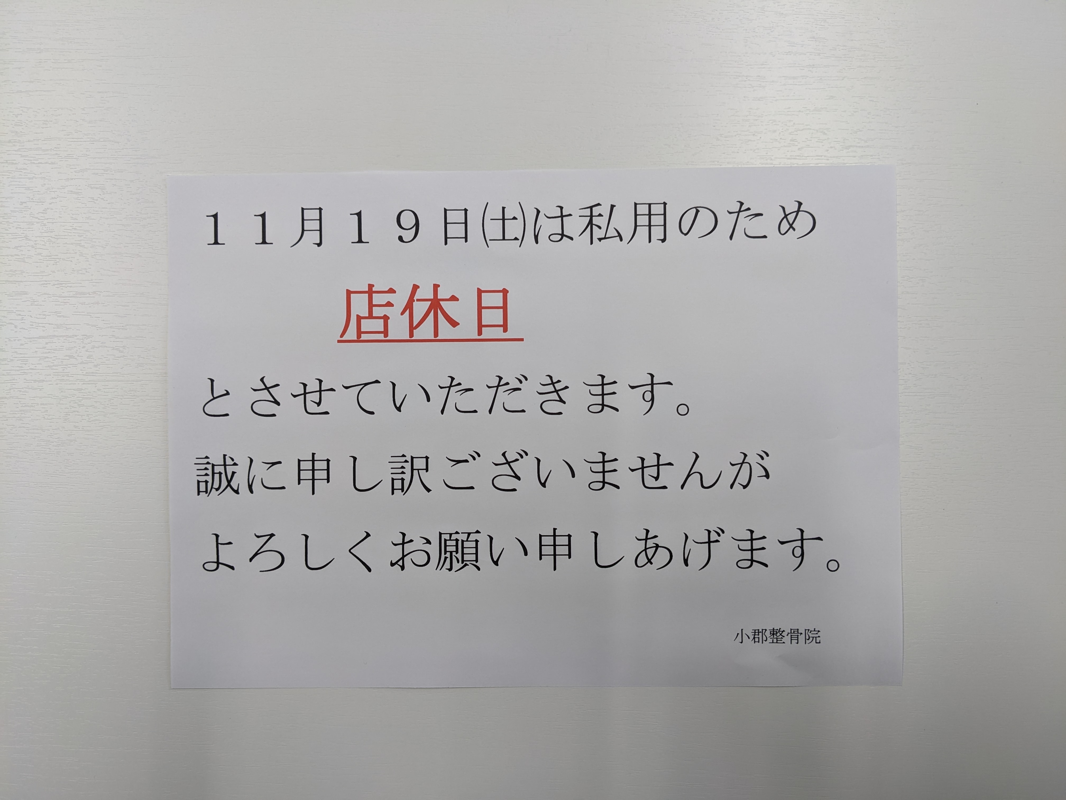 誠に勝手ながら、11月19日(土曜日)は店休日とさせていただきます。ご迷惑おかけいたします。