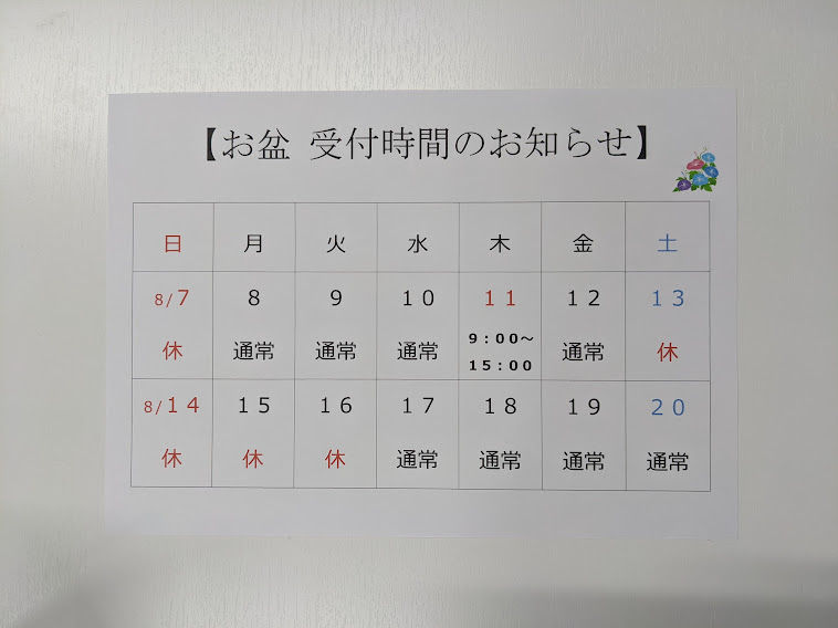 お盆の受付時間のお知らせです。